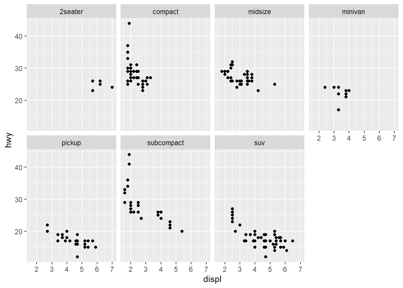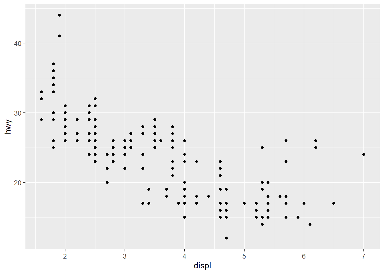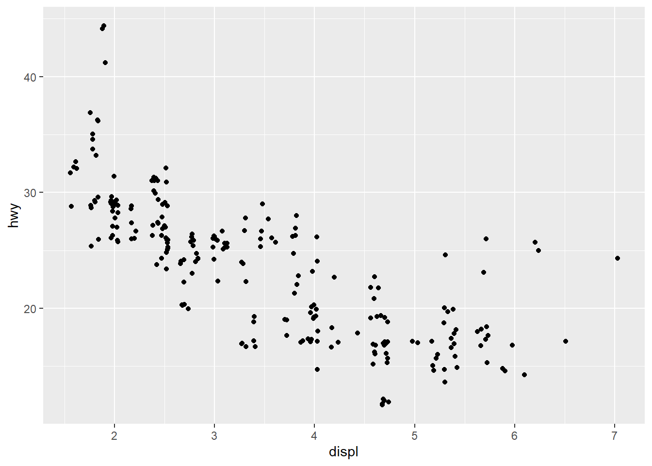 ggplot(data = mpg, mapping = aes(x = displ, y = hwy)) +