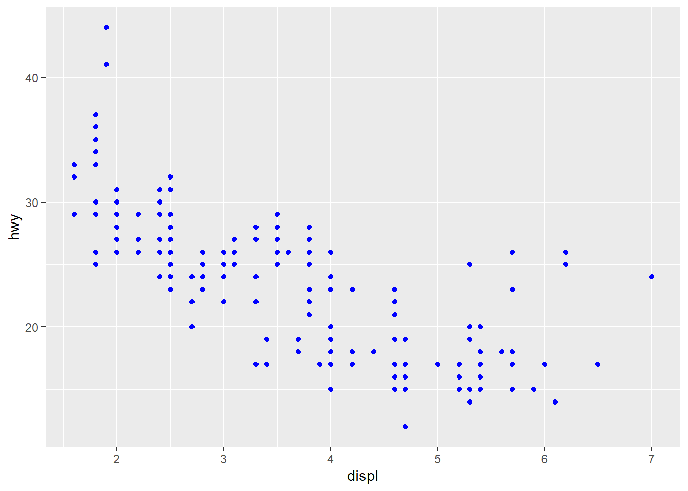 geom_point(mapping = aes(x = displ, y = hwy), color = "blue") +