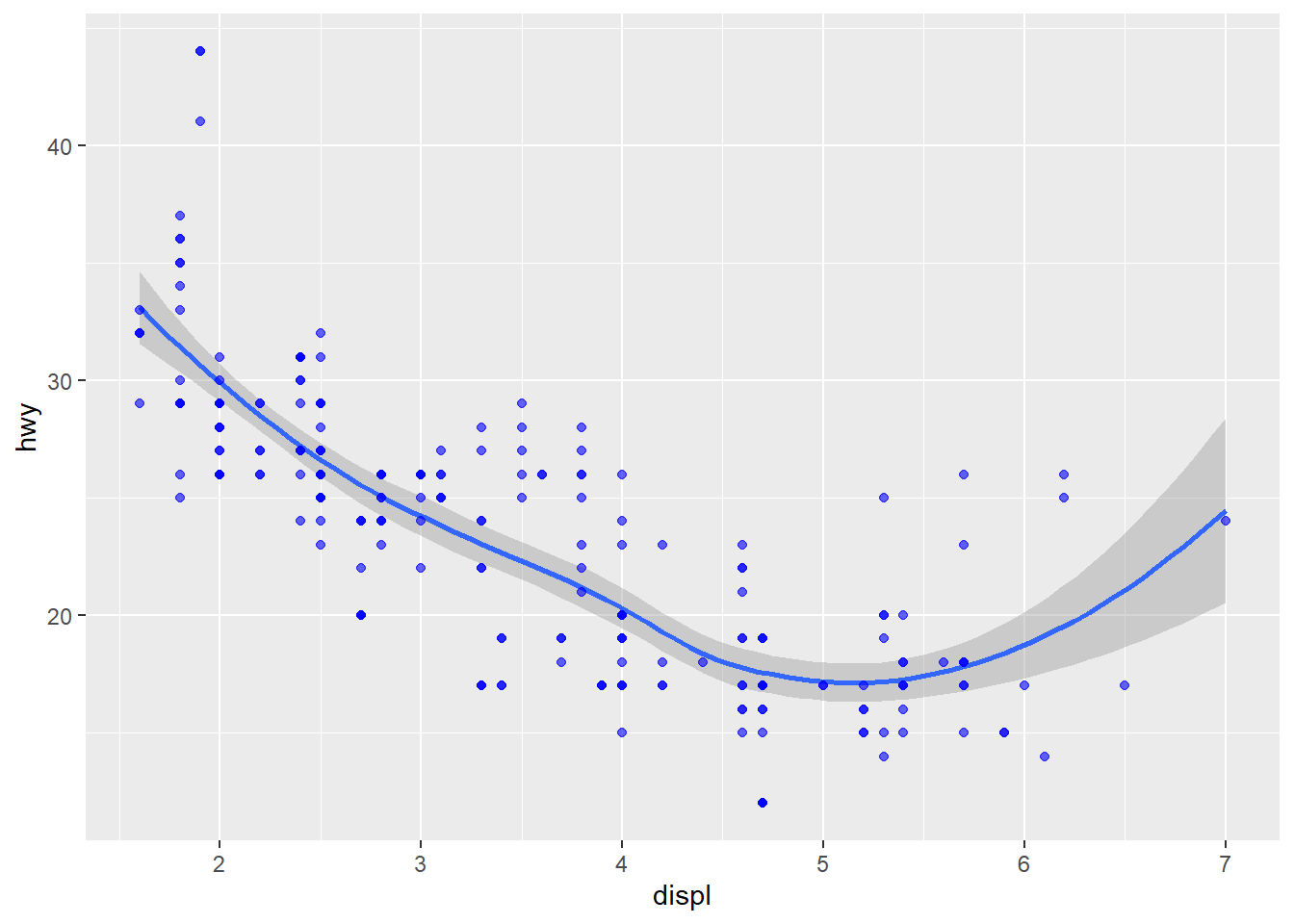 geom_point(aes(x = displ, y = hwy), color = "blue", alpha = .6) +
