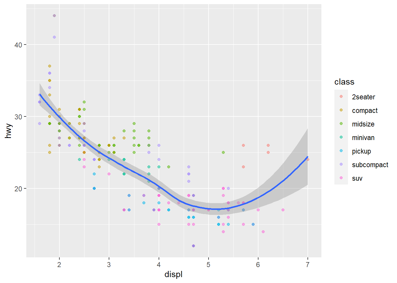 geom_smooth(mapping = aes(x = displ, y = hwy)) +