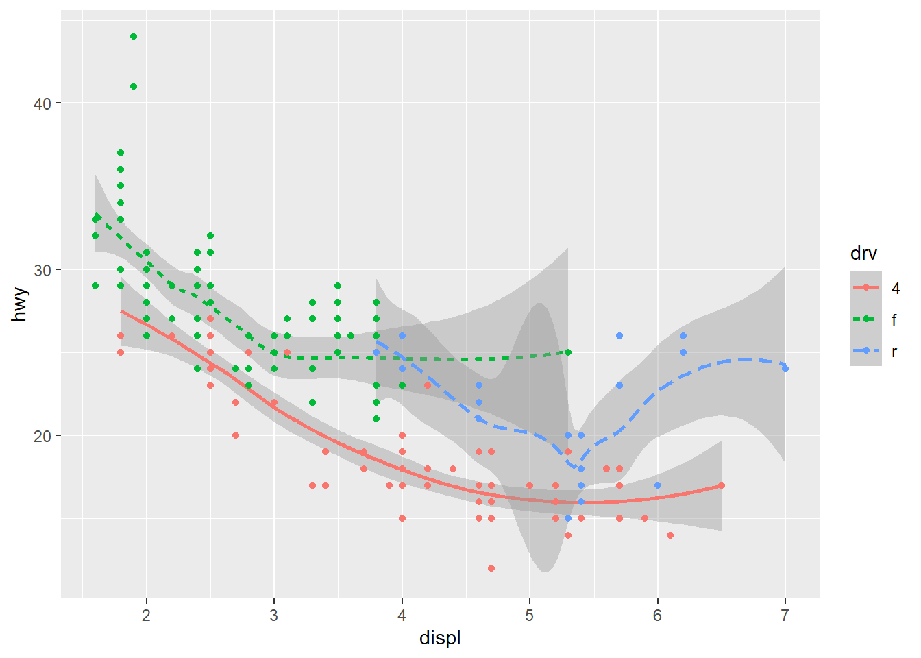 geom_smooth(mapping = aes(x = displ, y = hwy, linetype = drv, color = drv)) +
