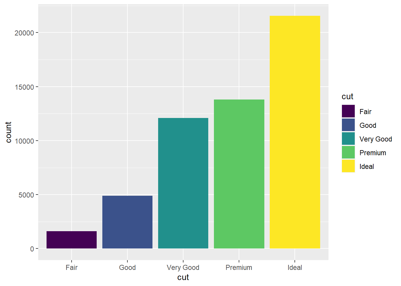 geom_bar(mapping = aes(x = cut, fill = cut)) +