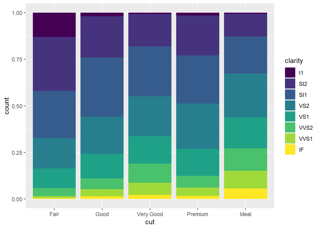 geom_bar(mapping = aes(x = cut, fill = clarity), position = "fill") +