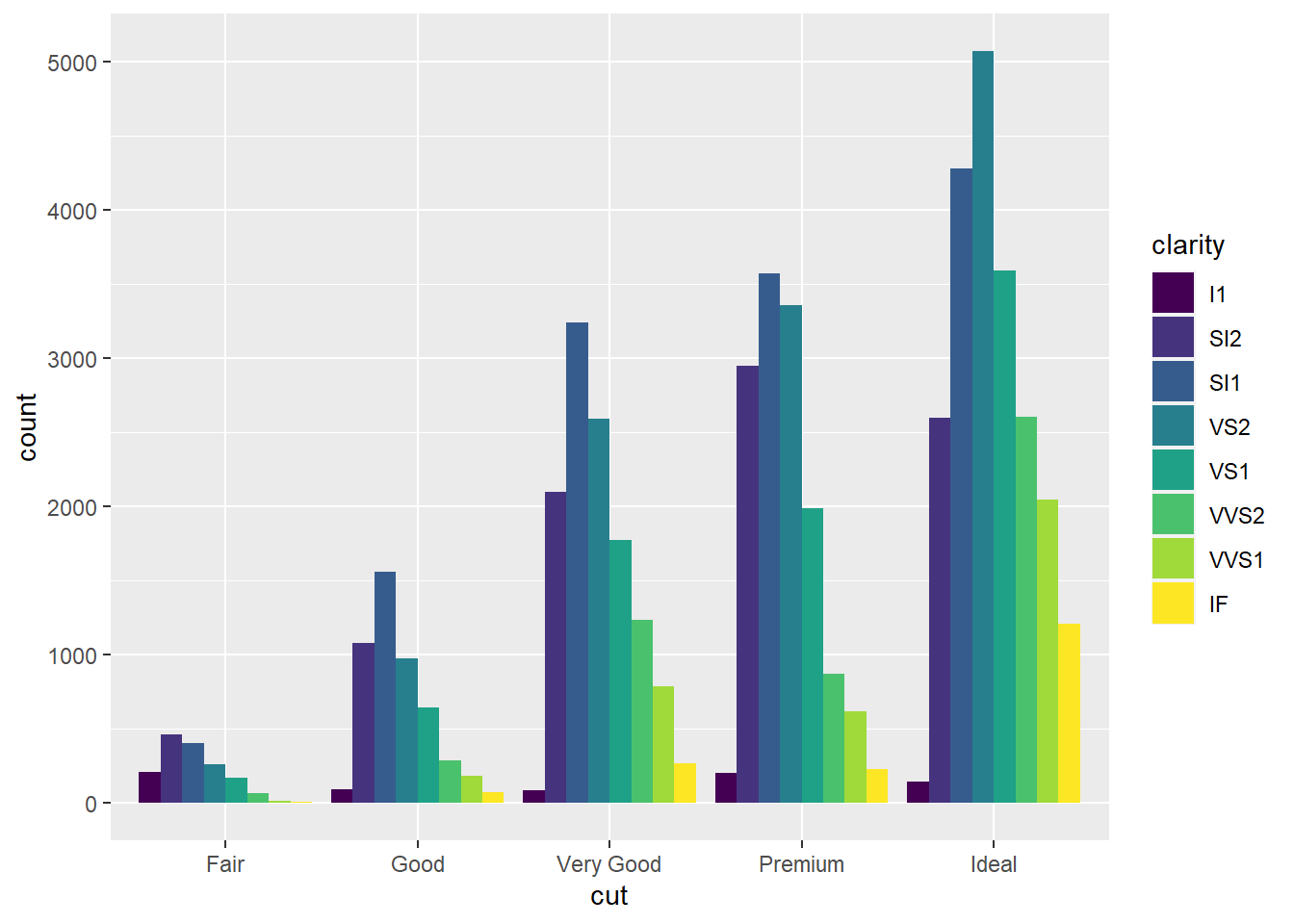 geom_bar(mapping = aes(x = cut, fill = clarity), position = "dodge") +