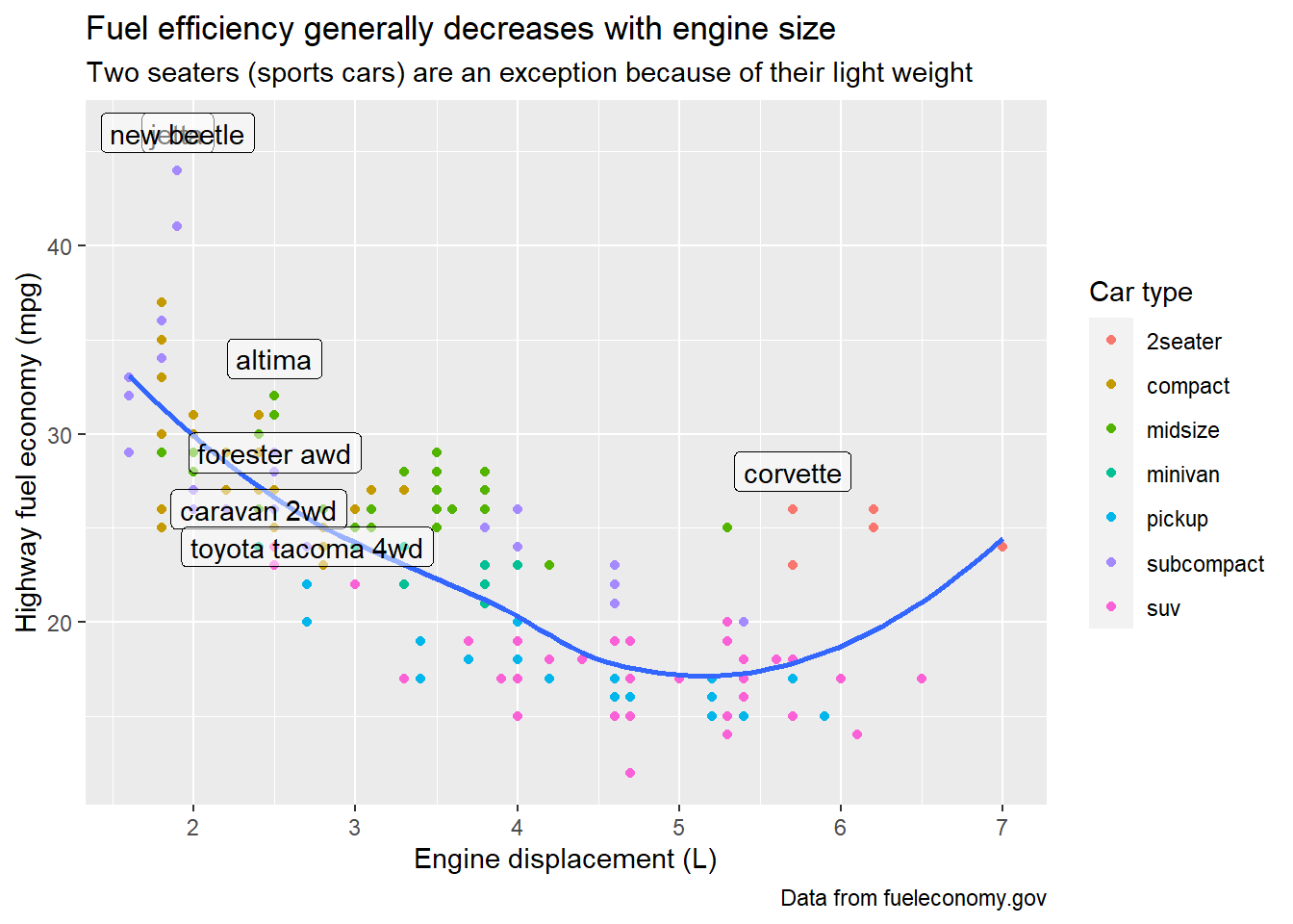 labs(title = "Fuel efficiency generally decreases with engine size",
