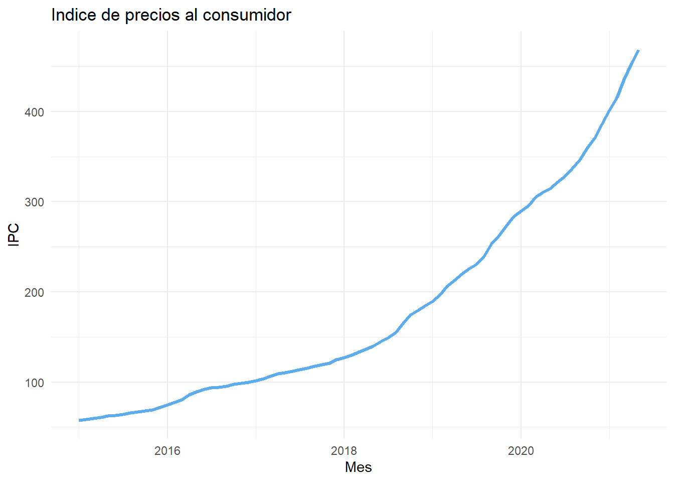 labs(title = 'Indice de precios al consumidor', x = 'Mes', y ='IPC') +