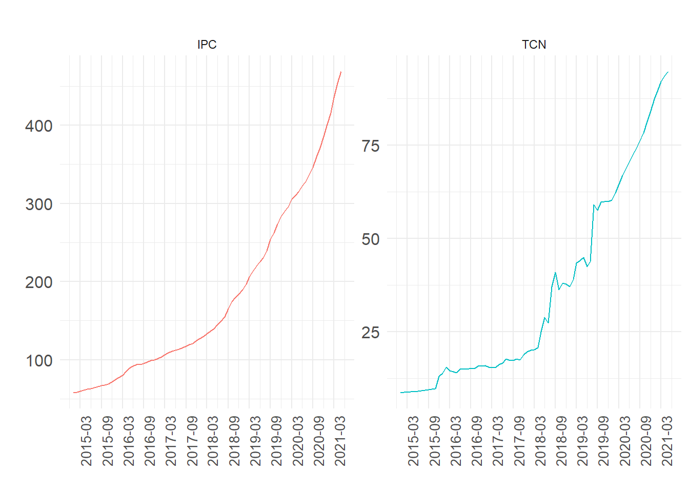 A veces, por problemas de escala, ggplot2 no maneja bien el eje secundario por lo que es preferible separar las series en 2 gráficos diferentes.