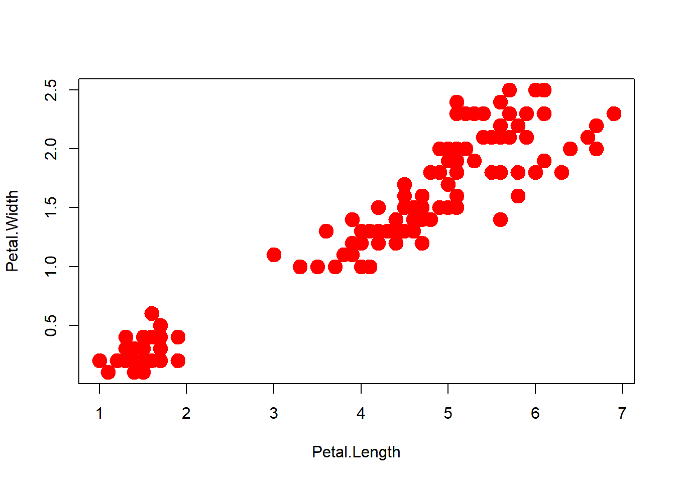 plot(Petal.Length,Petal.Width, col = "red", pch = 19, cex = 2)