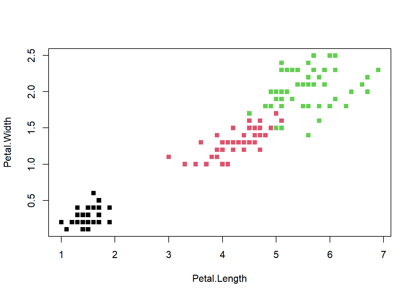 plot(Petal.Length,Petal.Width, col = Species, pch = 15, cex = 1)