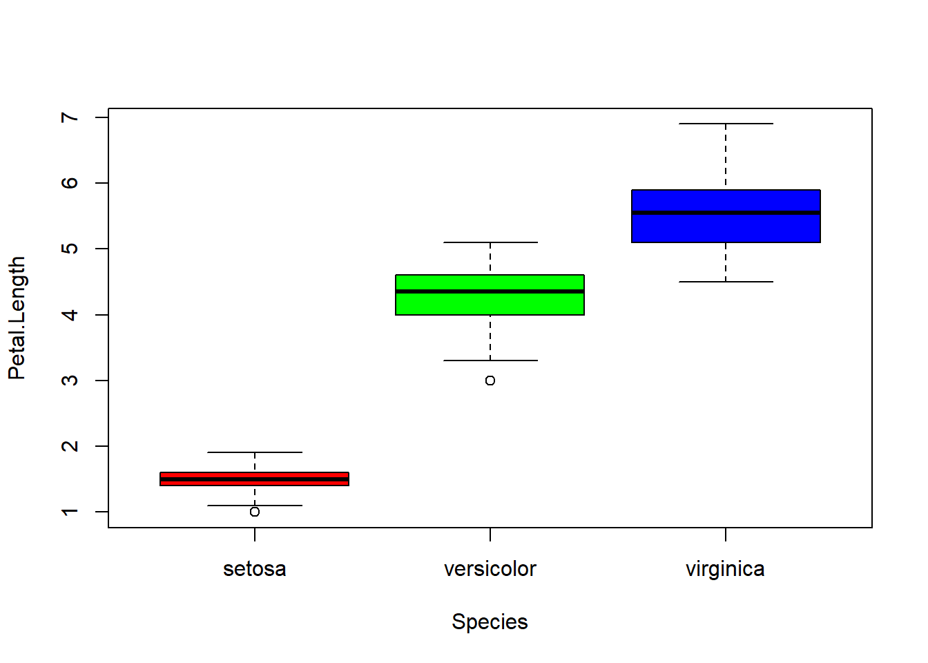 boxplot(Petal.Length ~ Species, col=rainbow(3))