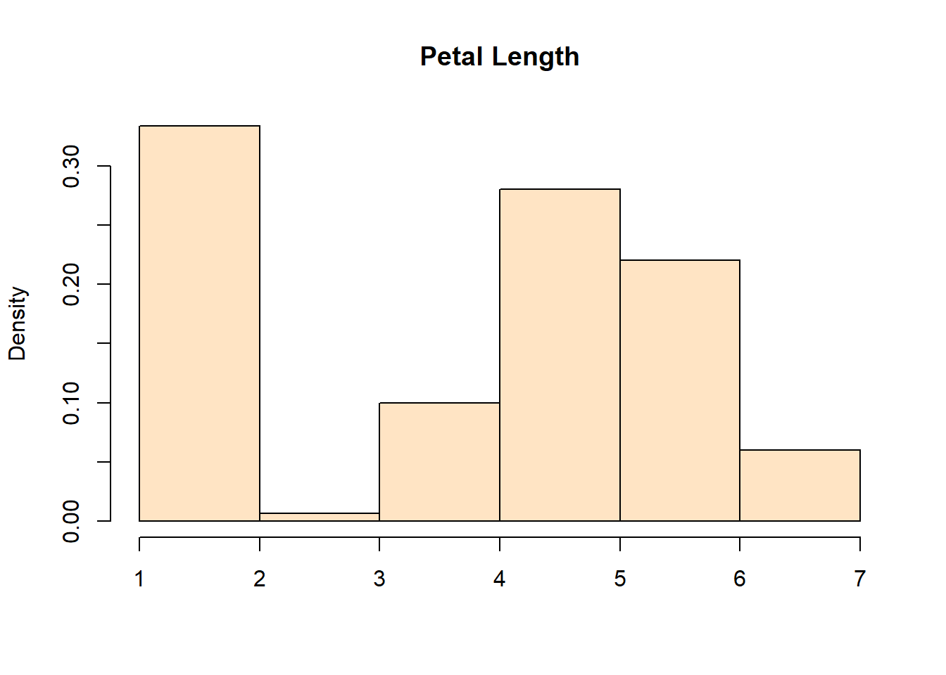 hist(Petal.Length, breaks = 'FD', prob = TRUE, main = "Petal Length", col = "bisque", xlab = "")