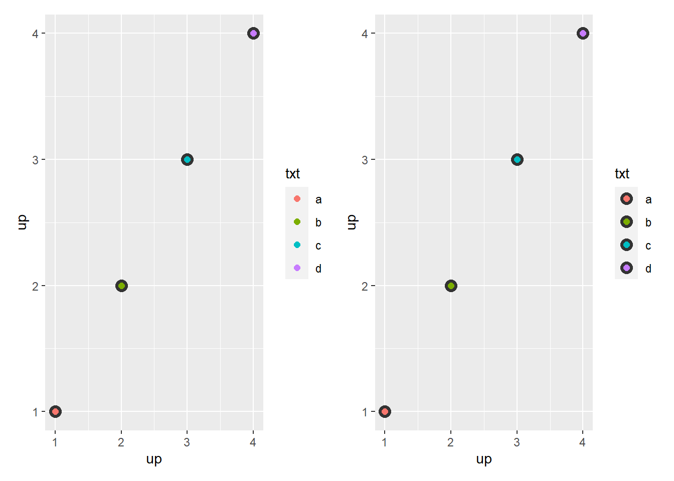 • override.aes: es útil cuando desea que los elementos de la leyenda se muestren de forma diferente a las geoms del gráfico. Esto suele ser necesario cuando ha utilizado transparencia o tamaño para lidiar con superposiciones.
