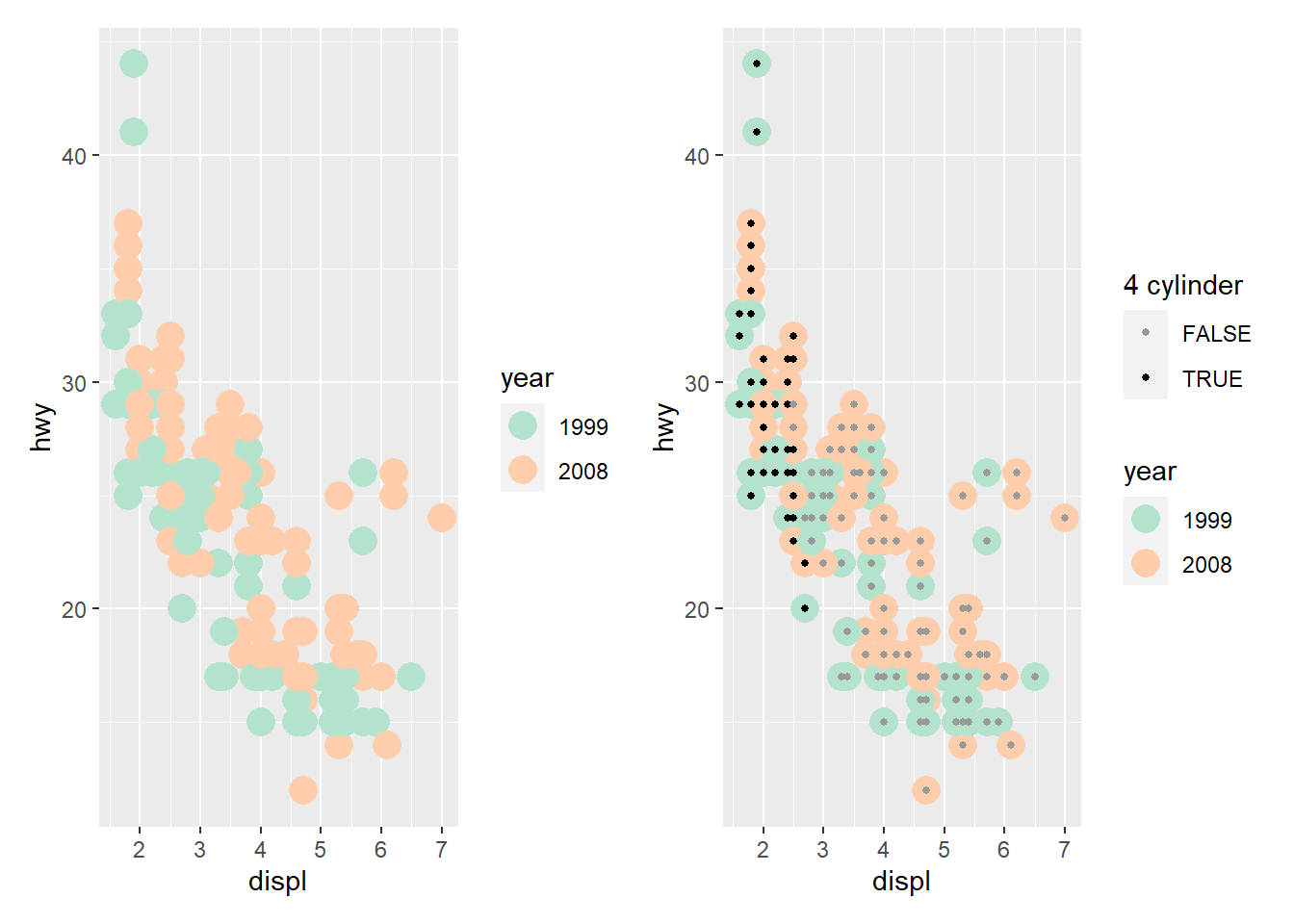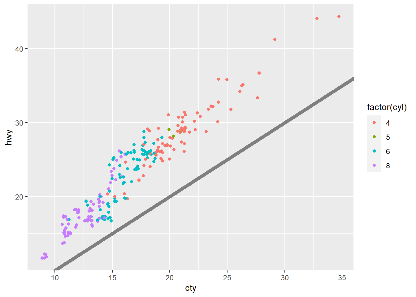 base <- ggplot(mpg, aes(cty, hwy, color = factor(cyl))) +