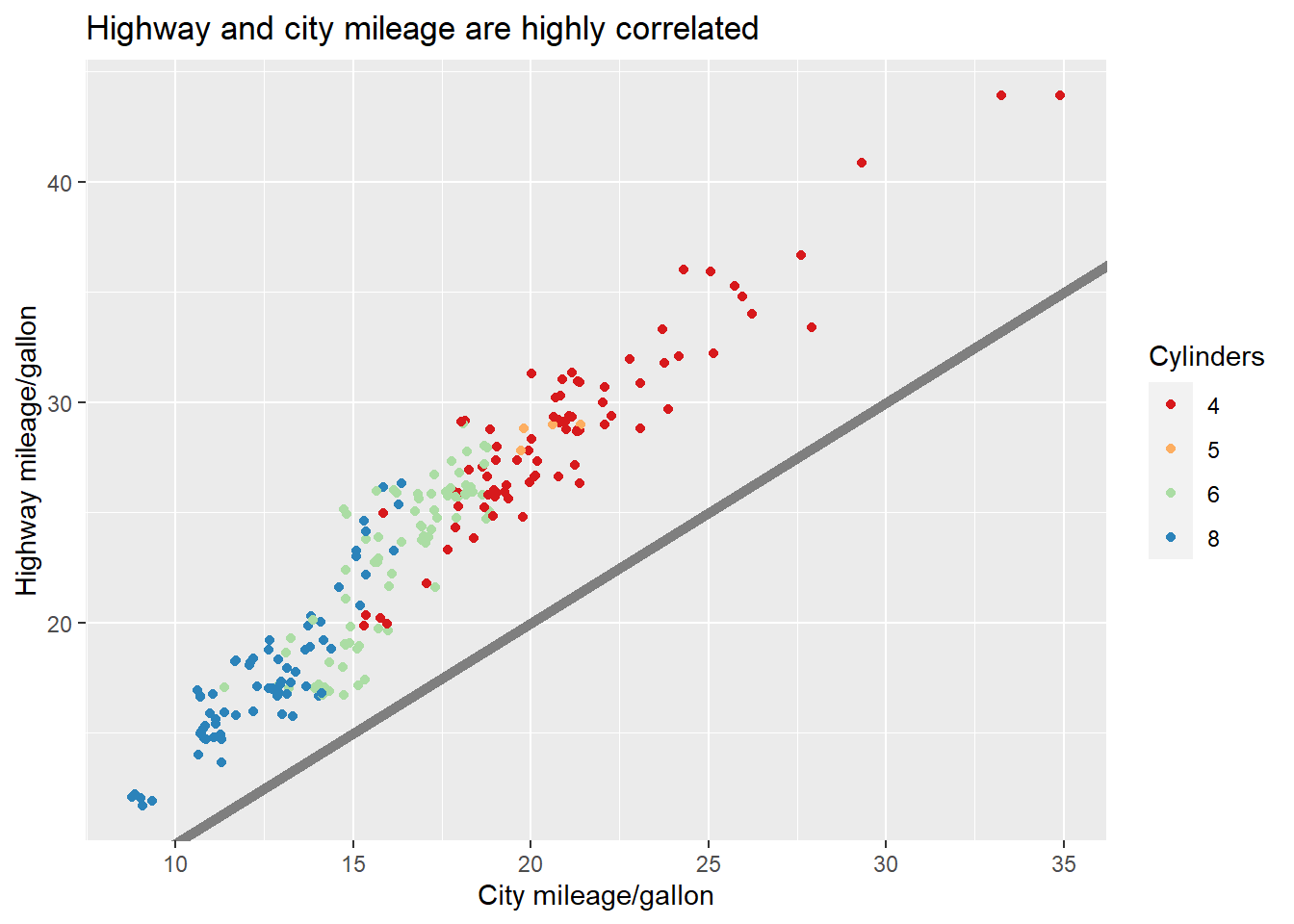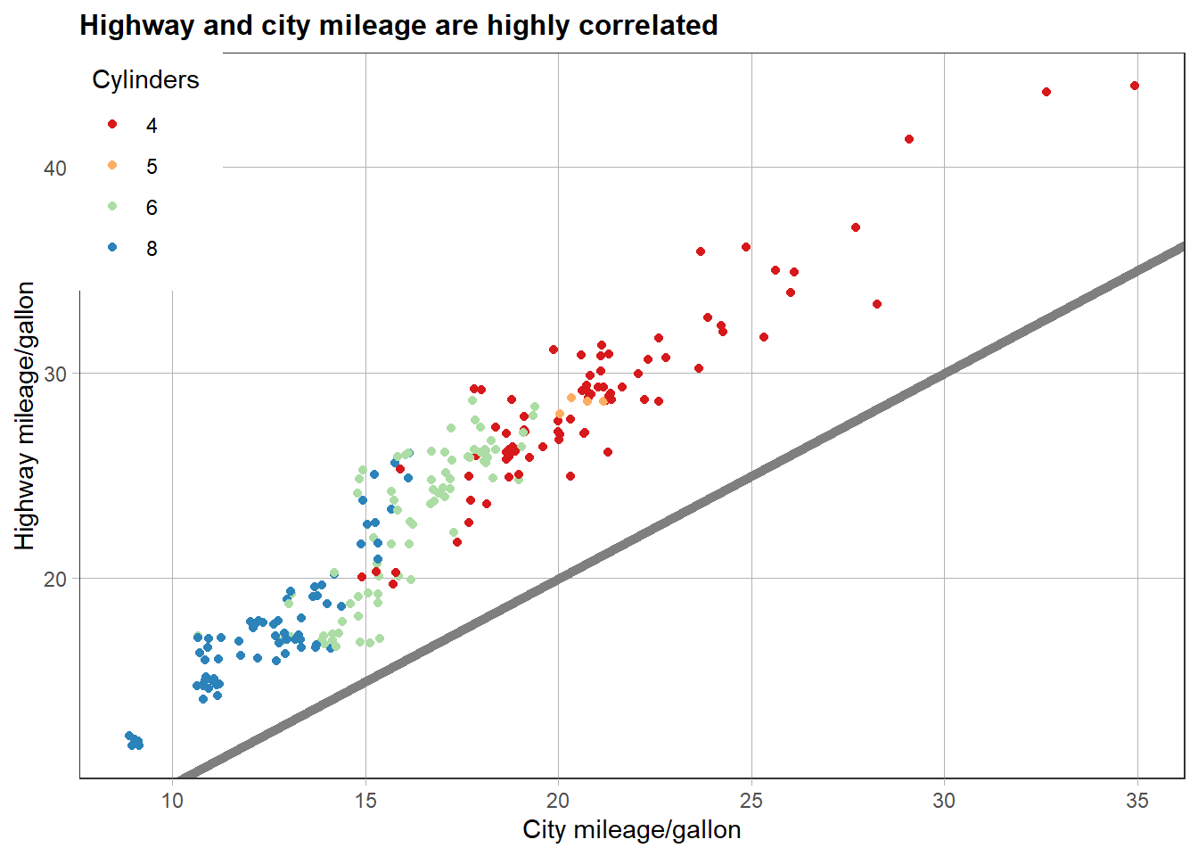 title = "Highway and city mileage are highly correlated"