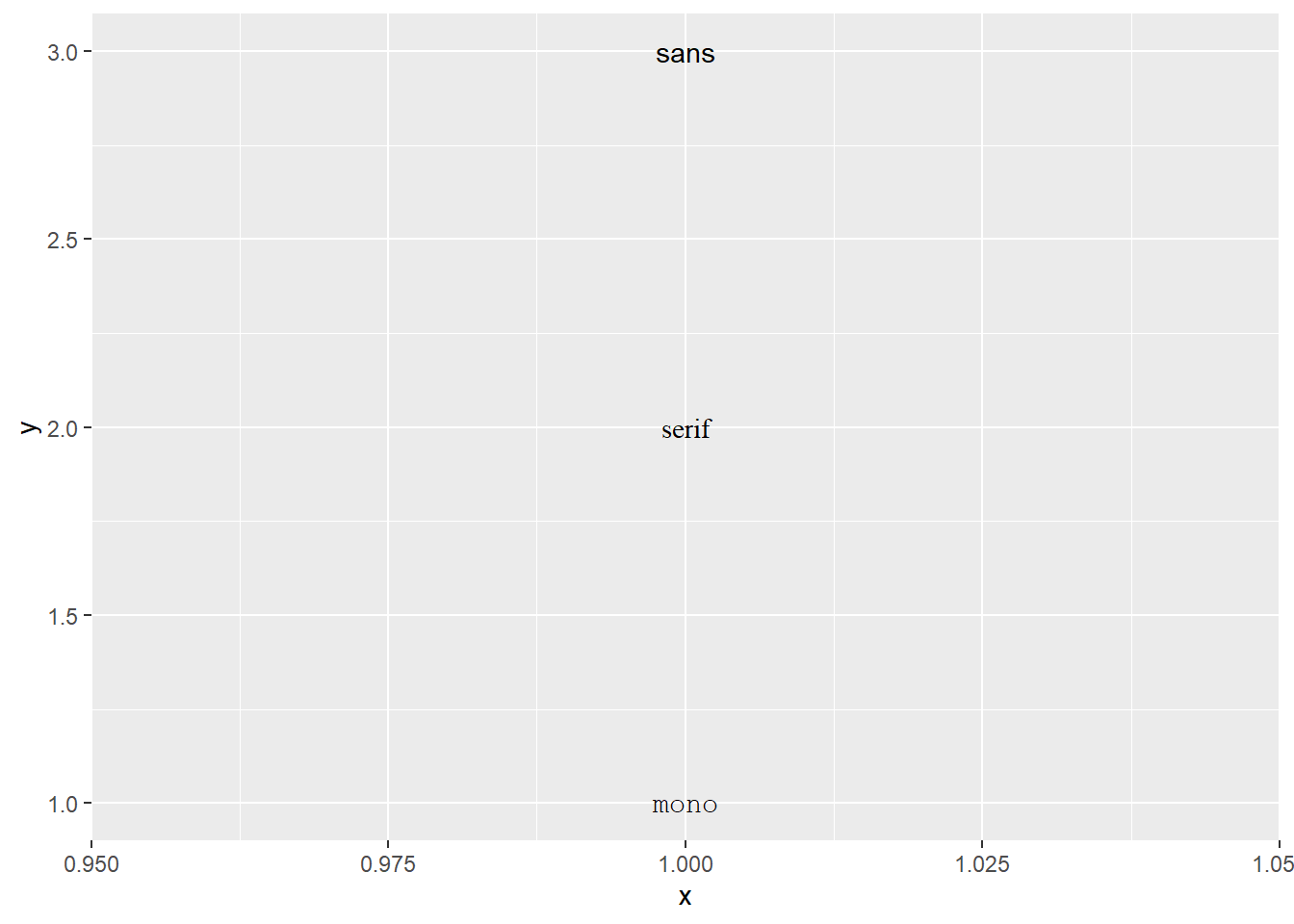 df <- data.frame(x = 1, y = 3:1, family = c("sans", "serif", "mono"))