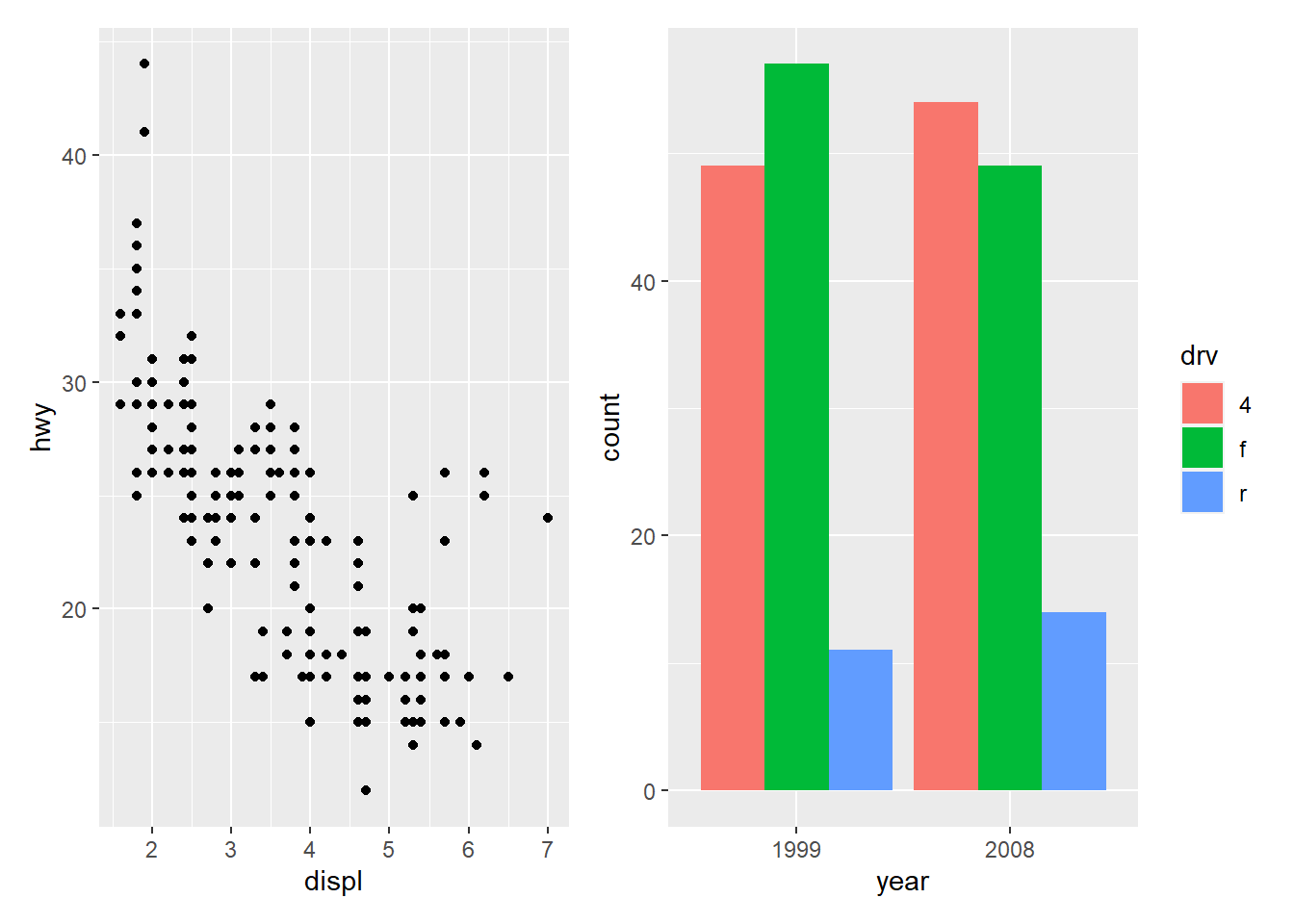 geom_bar(aes(x = as.character(year), fill = drv), position = "dodge") +