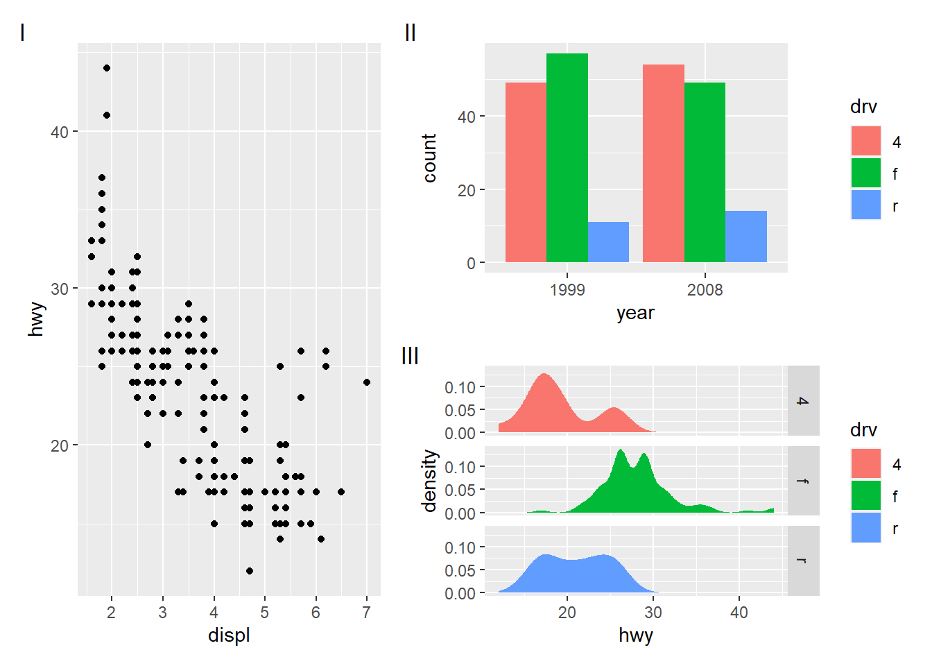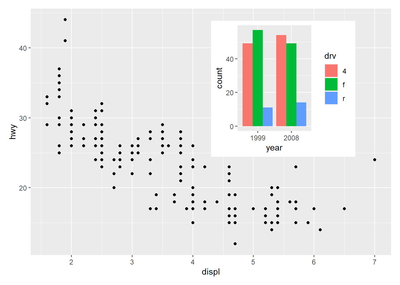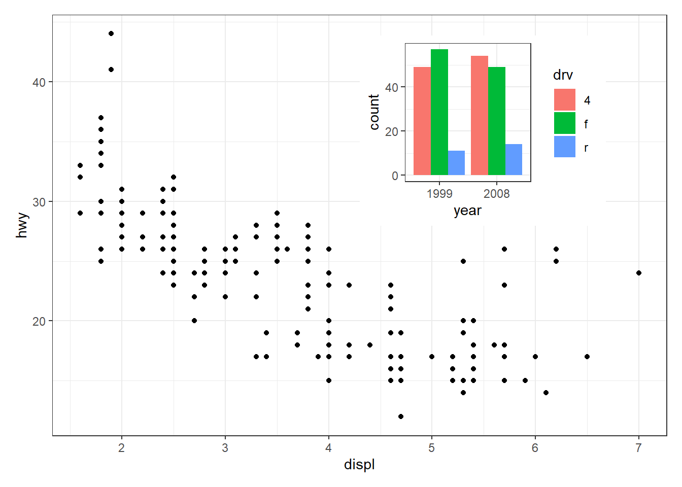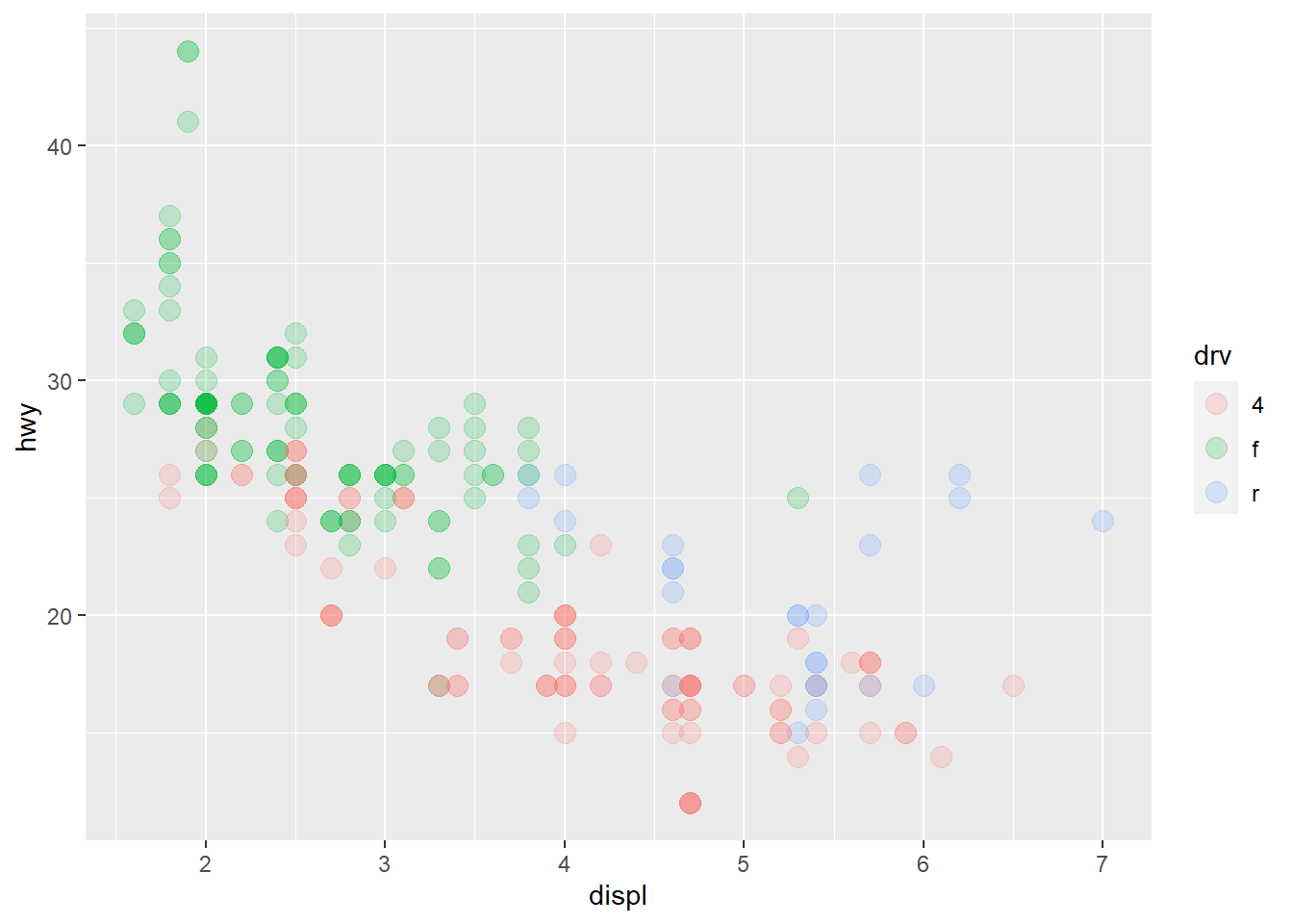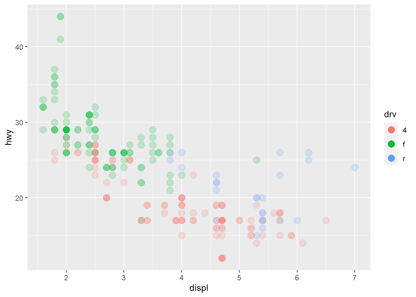 base <- ggplot(mpg, aes(displ, hwy, colour = drv)) +