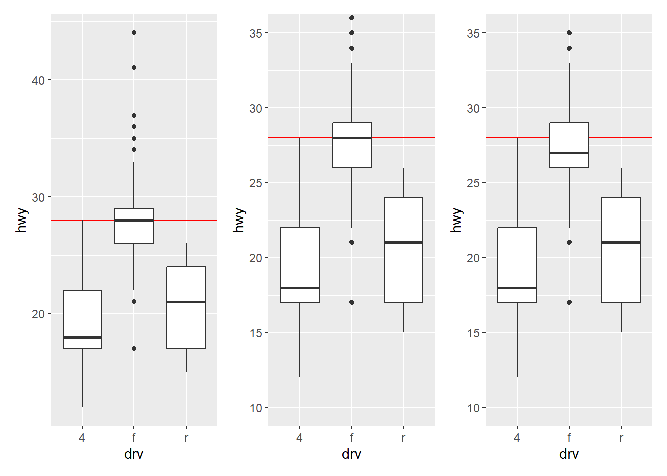 base <- ggplot(mpg, aes(drv, hwy)) +
