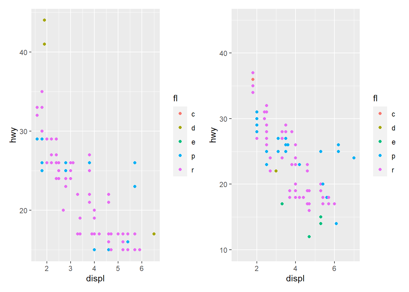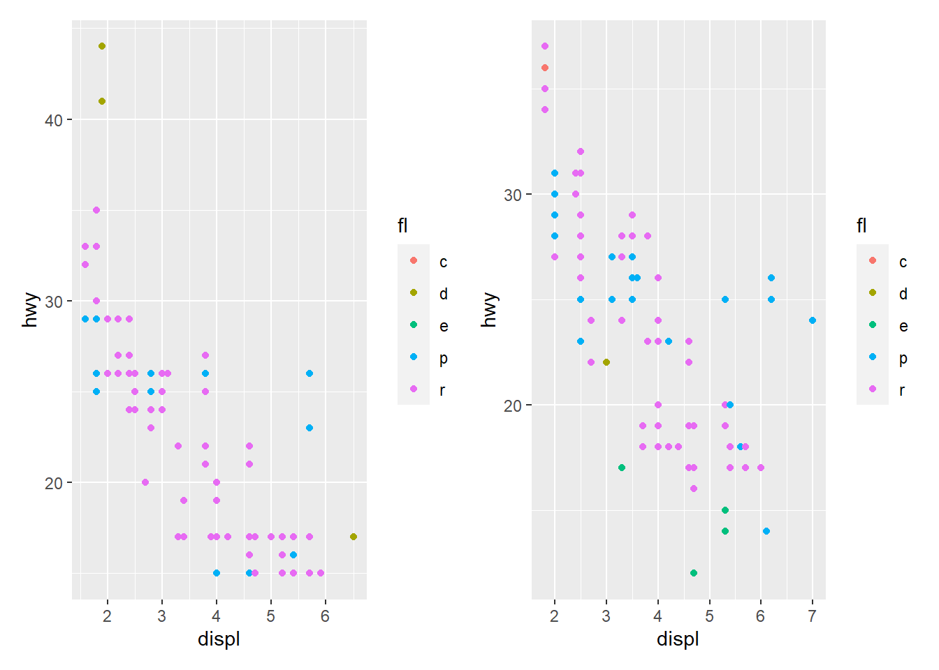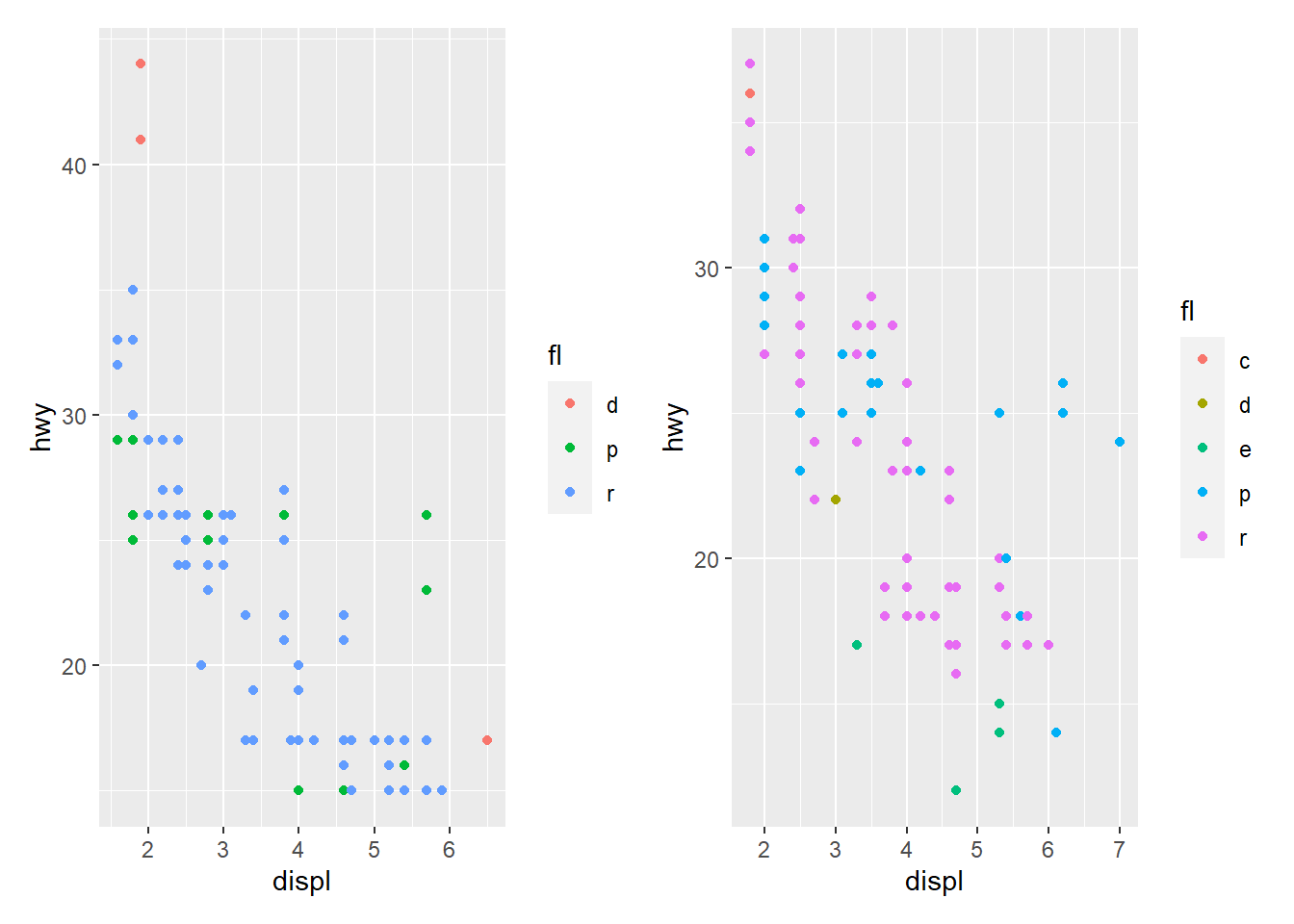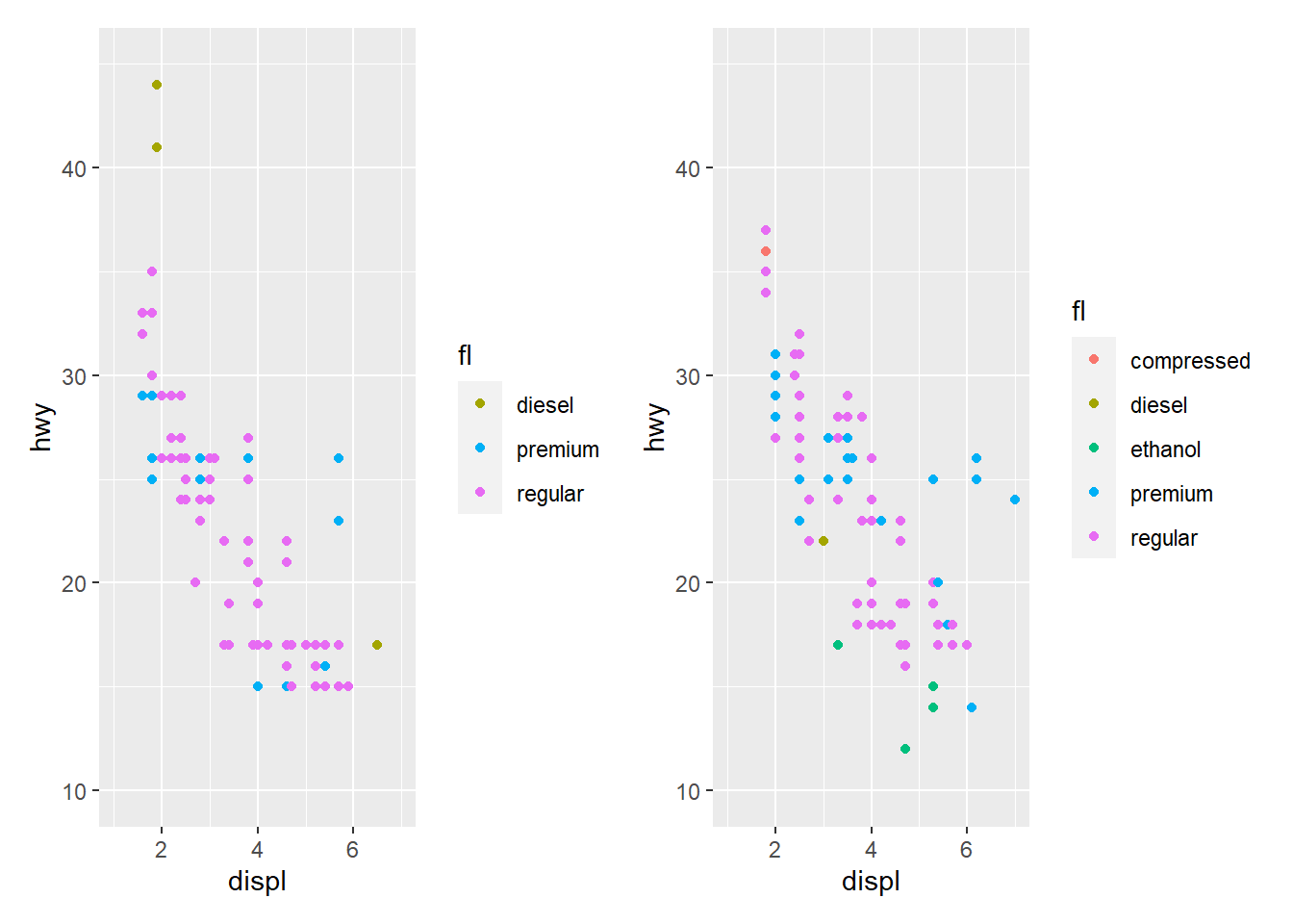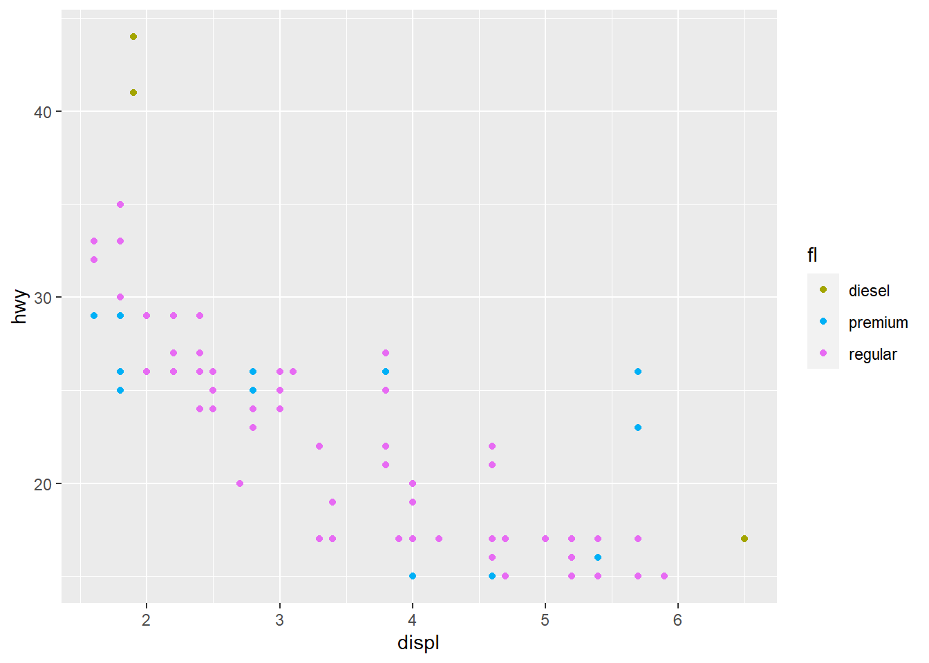 base_99 <- ggplot(mpg_99, aes(displ, hwy, colour = fl)) + geom_point()