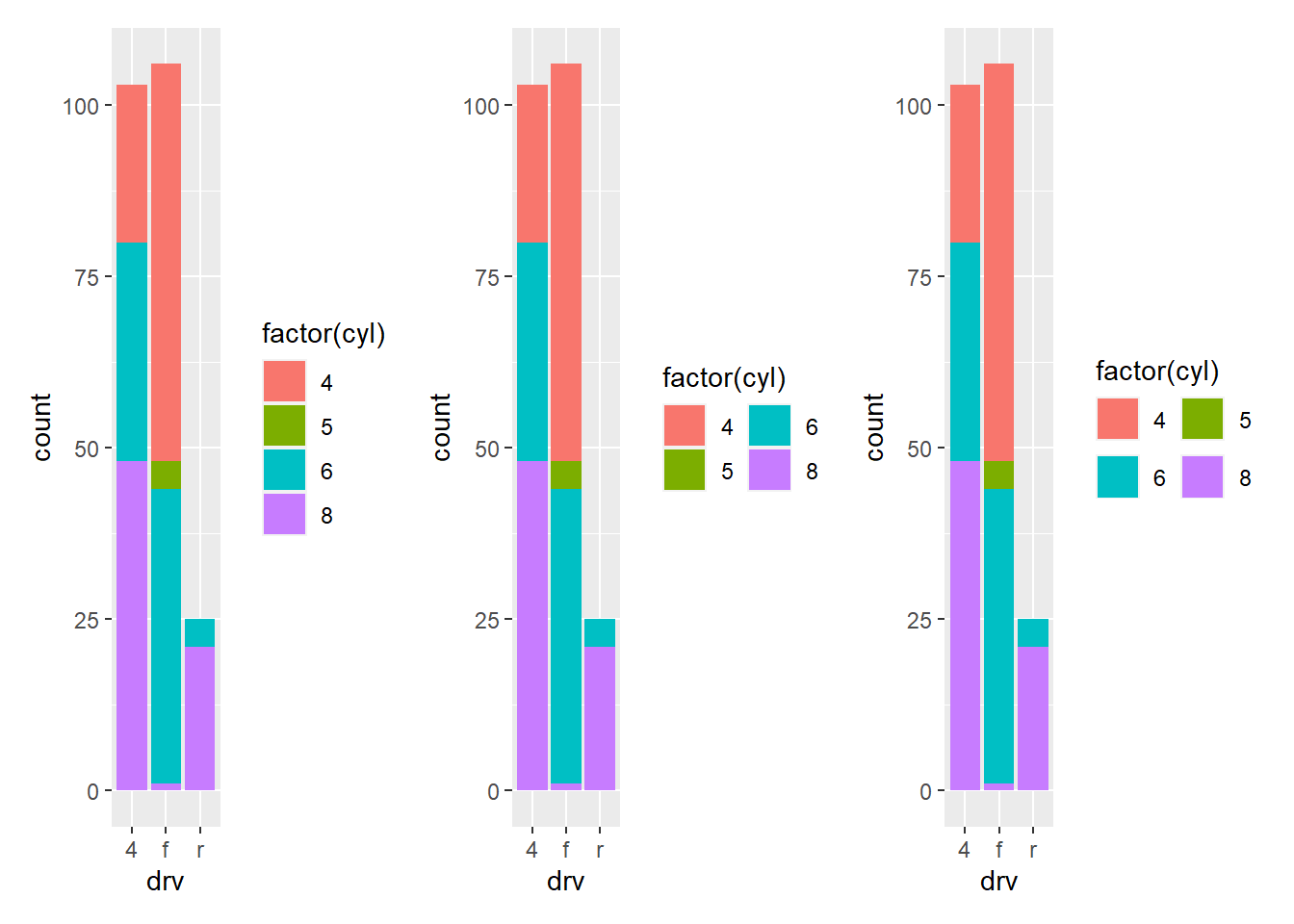 base <- ggplot(mpg, aes(drv, fill = factor(cyl))) + geom_bar()