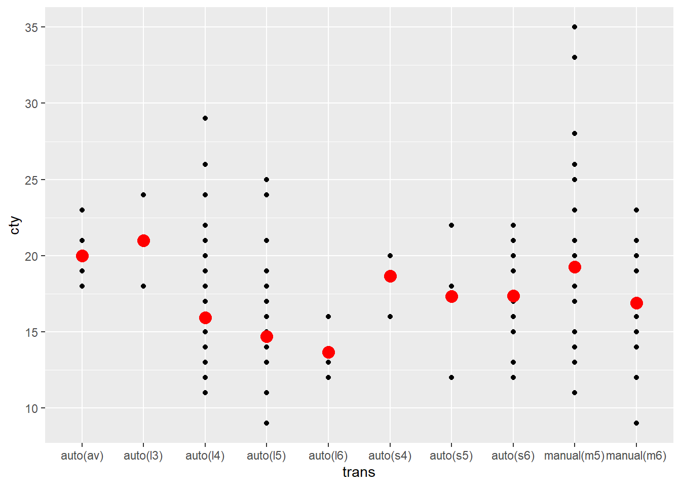 ggplot(mpg, aes(trans, cty)) +